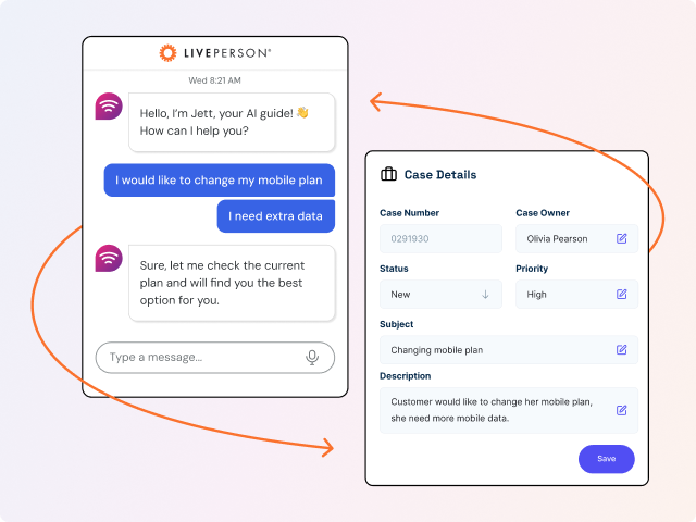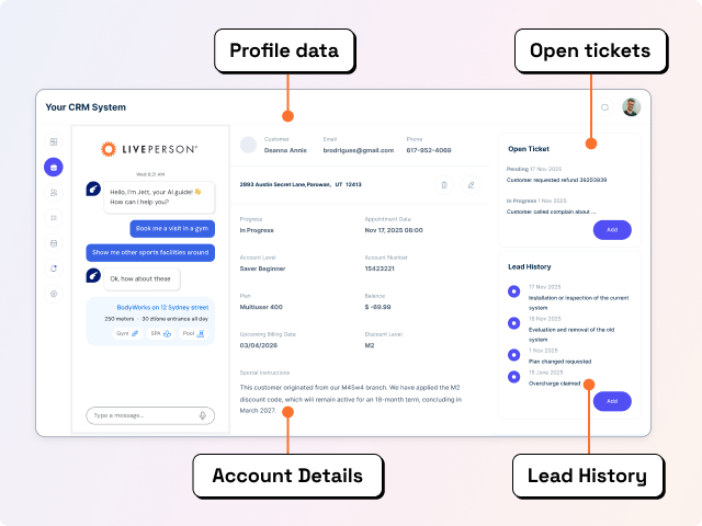 Bidirectional sync pulls customer profile data, open tickets, lead history, and account details directly into the LivePerson workspace so agents have everything they need exactly where the conversation is happening.