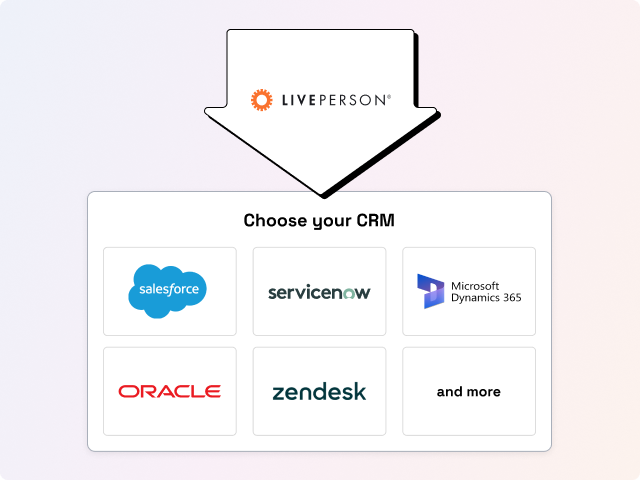 LivePerson Sync works out of the box with the CRMs your team already runs, and can be scoped for homegrown or custom systems too. It treats every customer interaction as a live event that can trigger automated actions, surface t he right data, and update records across your systems simultaneously.